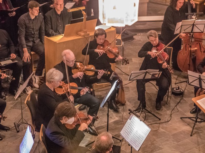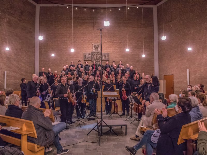 Hiddesen. 26.11. 2022. Eine voll besetzte Kirche, ein professionelles Instrumental-Ensemble, ein großer gemischter Chor mit einem erfreulichen Anteil jugendlicher Stimmen – das war allein vom Anblick her ein festlicher Auftakt in ein hochkarätiges Konzert. Der Altarraum fasste kaum den großen Chor, der sich aus drei gemischten Einzelchören zusammensetzte, nämlich dem MichaelisChor Hiddesen, dem Neuen Chor Warburg – beide Chöre von Annette Schmidt-Höngen geleitet – und dem Hiddeser Jugendchor VoiceKamp, einstudiert von seinem Leiter Max Jenkins. Fünf Gesangs- und zwei Instrumentalsolisten bereicherten den Klangkörper, der begleitet wurde von dem Instrumentalensemble La Réjouissance unter seinem Konzertmeister Gregor van den Boom.