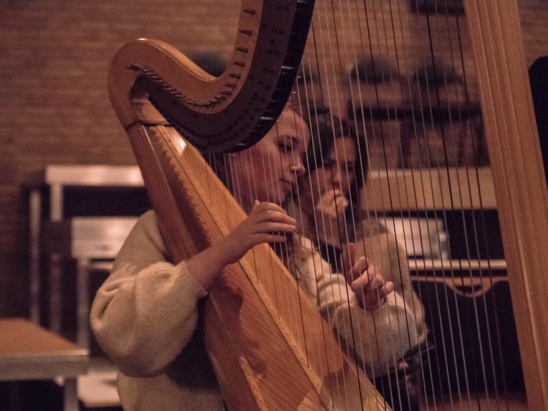 Die instrumentalen Zwischenstücke schufen Abwechslung in Klang und Klangfarbe. Michael Schmidt an der Orgel spielte in gewohnter Souveränität die Fantasie „Grand Chœur“ über ein französisches Weihnachtslied von César Franck, die, häufig rhythmisch pointiert, in Teilen aber auch kammermusikalisch filigran oder glanzvoll festlich vorgetragen, ein Gegengewicht zu den überwiegend lyrischen Christmas Carols bildete. Auch als Begleiter der Chorbeiträge an der Truhenorgel, ob dezent im Hintergrund agierend oder auch mal solistisch hervortretend, war er eine absolut verlässliche und sichere Stütze. Eine Harfe als Solo- und Ensembleinstrument zu hören, bietet sich nicht allzu häufig Gelegenheit. Im „Oratorio de Noël“ das Streicherensemble ergänzend, hatte die Harfenistin Sterre Koopman im ersten Teil des Konzerts auch Gelegenheit, sich in schöner Klangqualität als Soloharfenistin mit Variationen über ein altes Weihnachtslied von Marcel Samuel-Rousseau vorzustellen. Im weihnachtlich-lyrischen „Angel’s Carol“ (Lied der Engel) von John Rutter ergab sich im Zusammenspiel der Harfe mit den strahlkräftigen Solosopranistinnen Myriam Anna Dewald und Pia Viola Buchert eine weitere berührende Klangmischung.