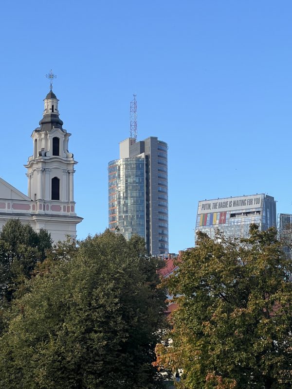 Während unserer Aufenthalte in Vilnius waren wir fußläufig zum Stadtzentrum und zur Altstadt in einem Hotel auf dem nördlichen Ufer der Neris, die Vilnius durchfließt, untergebracht. Beim Gang zu unserem Hotel blickten wir von der Neris aus auf ein an einem Hochhaus angebrachtes großflächiges Transparent mit den Großbuchstaben: „PUTIN, THE HAGUE IS WAITING FOR YOU“, darunter die Flaggen Litauens und der Ukraine sowie die Stadtflagge von Vilnius.