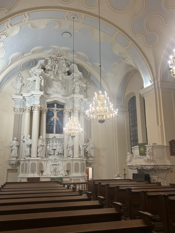 Nach einem Mittagessen in der Altstadt von Kaunas erreichten wir am Nachmittag wieder unser Hotel in Vilnius. Am frühen Abend trafen wir Mindaugas Sabutis. Er ist seit 2004 Bischof der Evangelisch-Lutherischen Kirche in Litauen und bereits seit 1998 Gemeindepfarrer in Vilnius. Bischof Sabutis lud uns ein in seinen Amtssitz und in seine prächtige, nach einem großen Stadtbrand Mitte des 18. Jahrhunderts erbaute barocke Kirche in der Vokiečių gatvė (Deutsche Straße). Während der sowjetischen Zeit wurde die barocke Einrichtung zerstört und die Kirche in eine Werkhalle und einen Sportsaal umfunktioniert. Die lutherische Gemeinde in Vilnius wurde bereits 1555 gegründet. Die 2008 erbaute Klais-Orgel fügt sich harmonisch in den Kirchenraum ein und verleiht ihm auch musikalischen Glanz.
