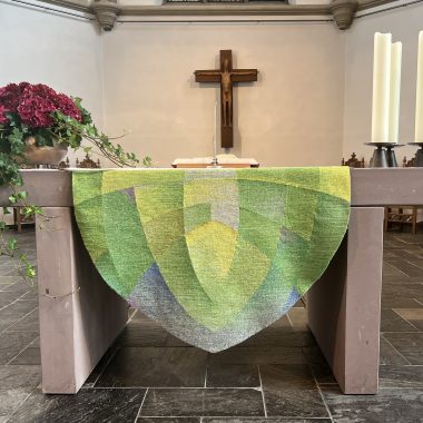 Seit einiger Zeit hängt es im Altarraum, unser neues Antependium – auch Parament genannt -, und ist eine wahre Zierde für den Altar. In der liturgischen Farbe „Grün“ des Kirchenjahres gehalten, bedeckt das Tuch den vorderen Altarbereich und verkündet dem Betrachter bereits beim Eintritt in den Kirchenraum die entsprechende Kirchenjahreszeit. Das grüne Tuch markiert die…