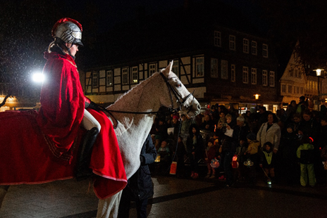 Der Detmolder Marktplatz steht am Sonntag, den 10. November wieder ganz im Zeichen des heiligen Martin. Die Kirchengemeinden der Innenstadt richten rund um den Kirchturm der Erlöserkirche das ökumenische St. Martinsfest aus. Die Eröffnung findet um 17 Uhr auf der Rathaustreppe statt. Dort wird die Geschichte des tatkräftigen Christen lebendig und ein Posaunenchor spielt. Anschließend wird Sankt Martin hoch zu Ross einen Laternengang durch die Fußgängerzone anführen. Die Freiwillige Feuerwehr begleitet ihn mit ihren leuchtenden Fackeln. Durch den Schlosspark geht es zurück zum Marktbrunnen. Dort erhält jedes Kind eine frische Brezel, die der Bürgermeister spendet. Es wird auch leckerer Kinderpunsch ausgeschenkt und neben der Laterne darf auch eine Tasse mitgebracht werden.